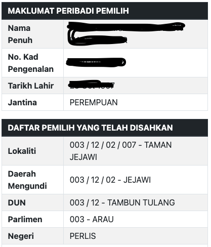 - Maklumat peribadi anda dan daerah mengundi akan dipaparkan: