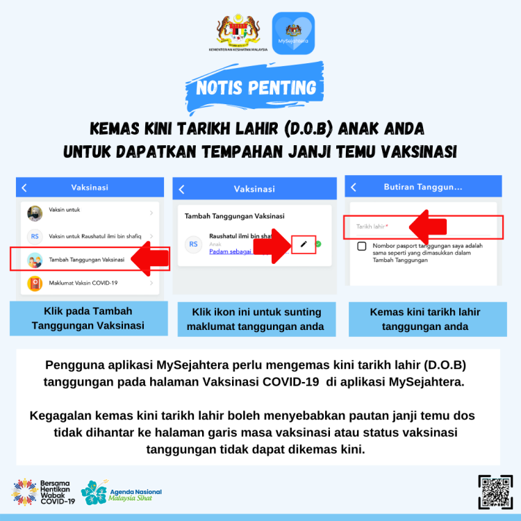 Pengguna aplikasi MySejahtera perlu mengemas kini tarikh lahir (D.O.B) tanggungan pada halangan vaksinasi Covid-19 di aplikasi MySejahtera. Kegagalan kemas kini tarikh lahir boleh menyebabkan pautan janji temu dos tidak dihantar ke halaman garis masa vaksinasi atau status vaksinasi tanggungan tidak dapat dikemas kini.