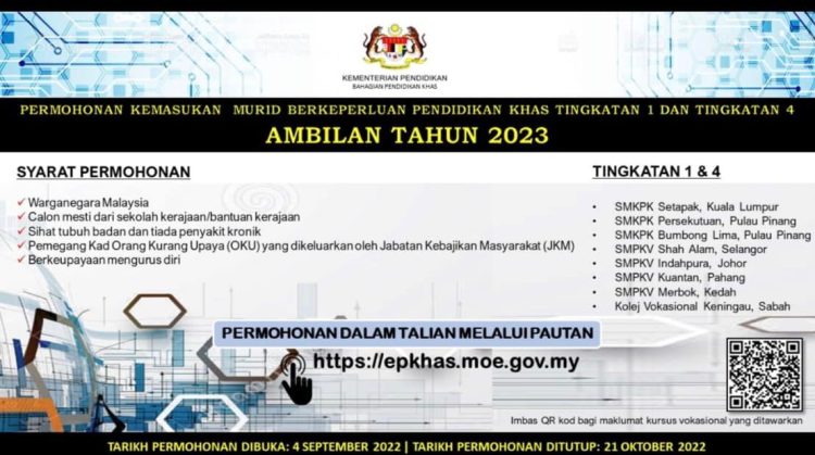 Sukacita dimaklumkan Kementerian Pendidikan Malaysia kini telah membuka Permohonan Kemasukan Murid Bekeperluan Pendidikan Khas (MBPK) Tingkatan 1 dan Tingkatan 4 Ambilan Tahun 2023 dibuka mulai 4 September 2022. Ibu bapa yang berminat nak daftarkan anak yang merupakan pemegang kad OKU boleh buat permohonan sekarang.