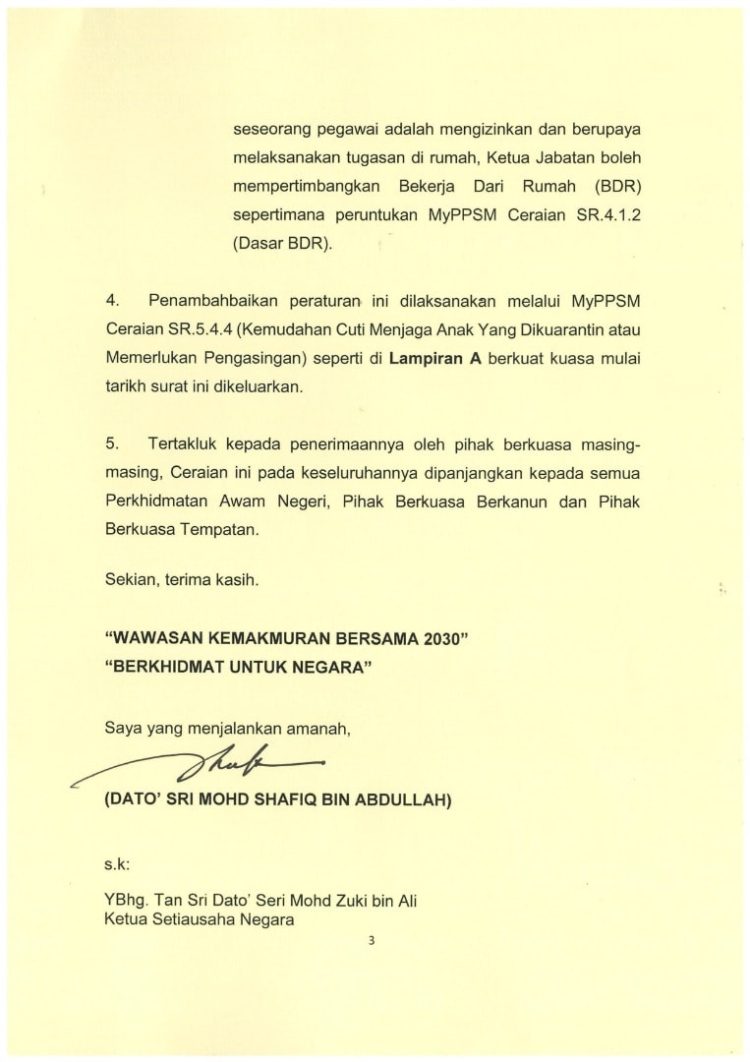 Selain itu, apabila keadaan seseorang pegawai mengizinkan dan berupaya melaksanakan tugasan di rumah, Ketua Jabatan boleh mempertimbangkan Bekerja Dari Rumah sepertimana peruntukan Pekeliling Perkhidmatan Sumber Manusia (MyPPSM) (Dasar BDR).