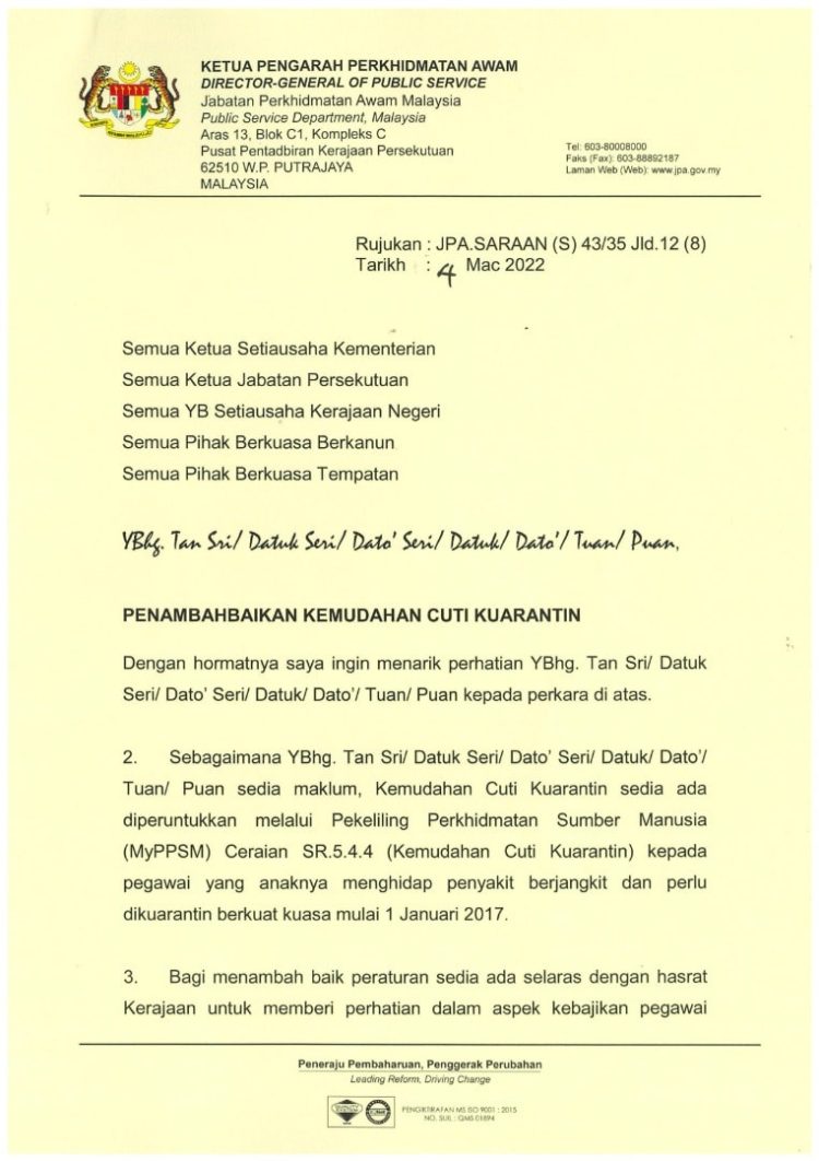 Berkuatkuasa mulai 4 Mac 2022, Kerajaan telah bersetuju untuk memanjangkan kemudahan cuti kuarantin kepada lain-lain penyakit berjangkit yang perlu dikuarantin atau memerlukan pengasingan. Menurut Ketua Pengarah Perkhidmatan Awam (KPPA) Datuk Seri Mohd Shafiq Abdullah memaklumkan kemudahan itu sebelum ini terhad kepada beberapa penyakit sahaja.