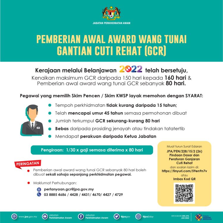 Untuk maklumat lanjut berhubungi perkata GCR, anda boleh ajukan ke talian 03 8885 4686// 4428/ 4431/ 4670/ 4427/ 4729 atau emel ke pertanyaan.gcr@jpa.gov.my.