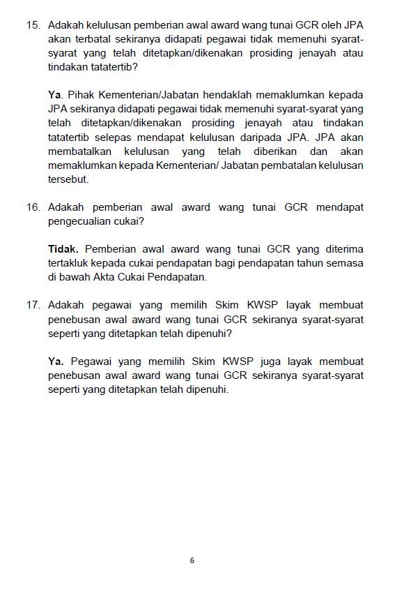 • Pengiraan pemberian awal award wang tunai GCR menggunakan formula yang sama bagi pengiraan GCR apabila seseorang pegawai bersara