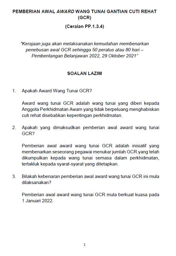 Kerajaan melalui pembentangan Belanjawan 2022 bersetuju menaikkan jumlah hari maksimum gantian cuti rehat (GCR) daripada 150 hari kepada 160 hari dan membenarkan pemberian awal award wang tunai GCR sebanyak 80 hari mulai Januari 2022.