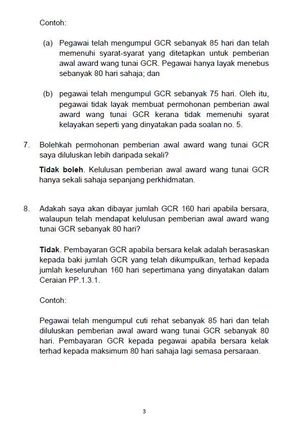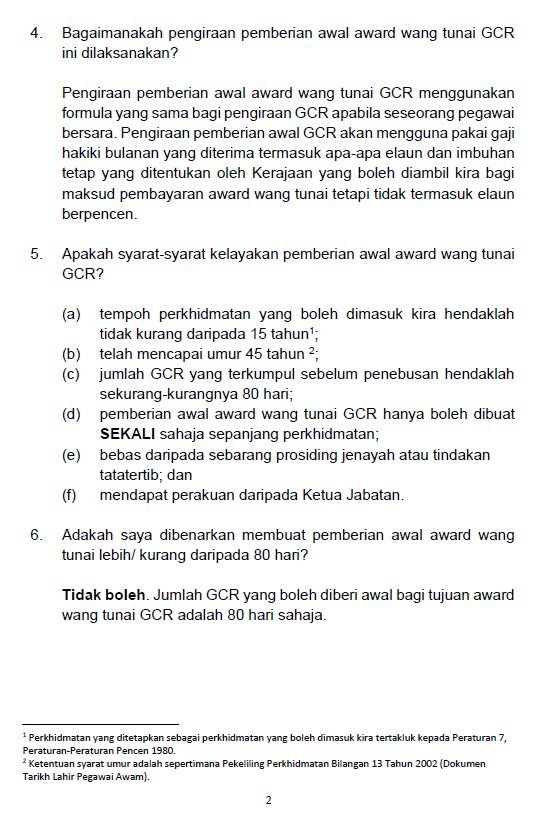 • Pengiraan pemberian awal GCR akan mengguna pakai gaji hakiki bulanan yang diterima termasuk apa-apa elaun dan imbuhan tetap yang ditentukan oleh kerajaan yang boleh diambil kira bagi maksud pembayaran award wang tunai tetapi tidak termasuk elaun berpencen