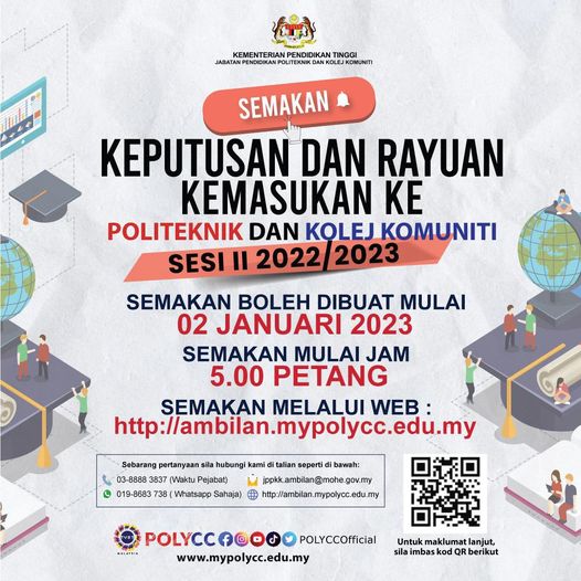 Semakan keputusan bagi kemasukan ke Politeknik dan Kolej Komuniti sesi II 2022/2023 boleh dibuat pada: