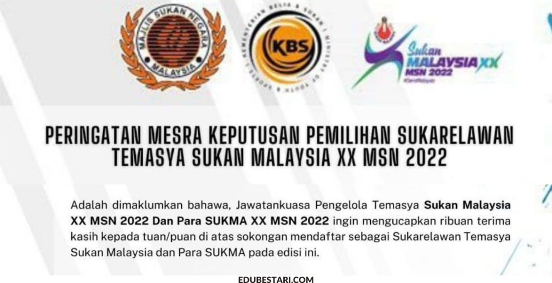 Adalah dimaklumkan bahawa, Jawatankuasa Pengelola Temasya Sukan Malaysia XX MSN 2022 dan Para SUKMA XX MSN 2022 ingin mengucapkan ribuan terima kasih kepada tuan/ puan di atas sokongan mendaftar sebagai Sukarelawan Temasya Sukan Malaysia dan Para SUKMA pada edisi ini.