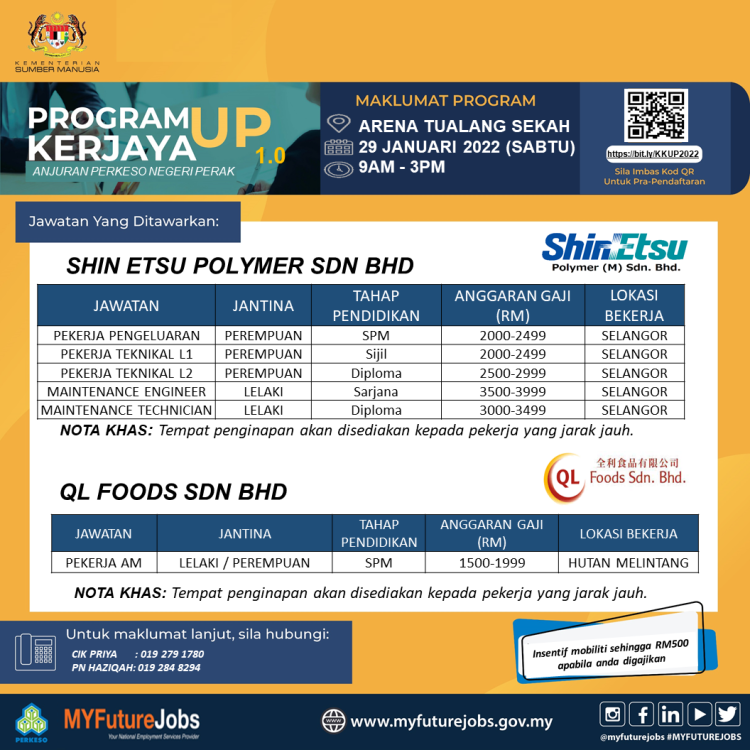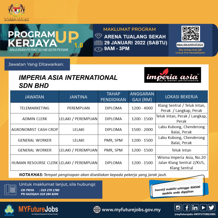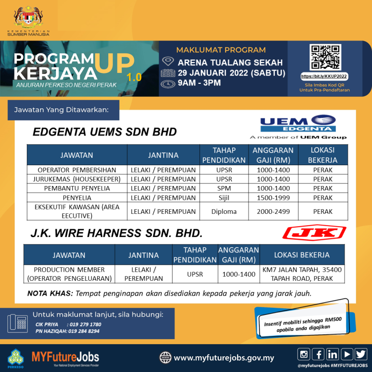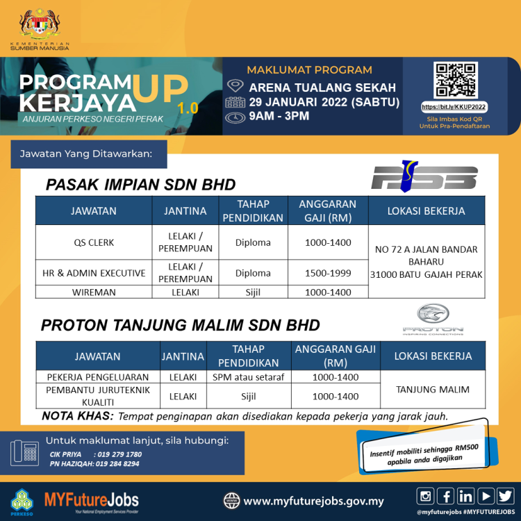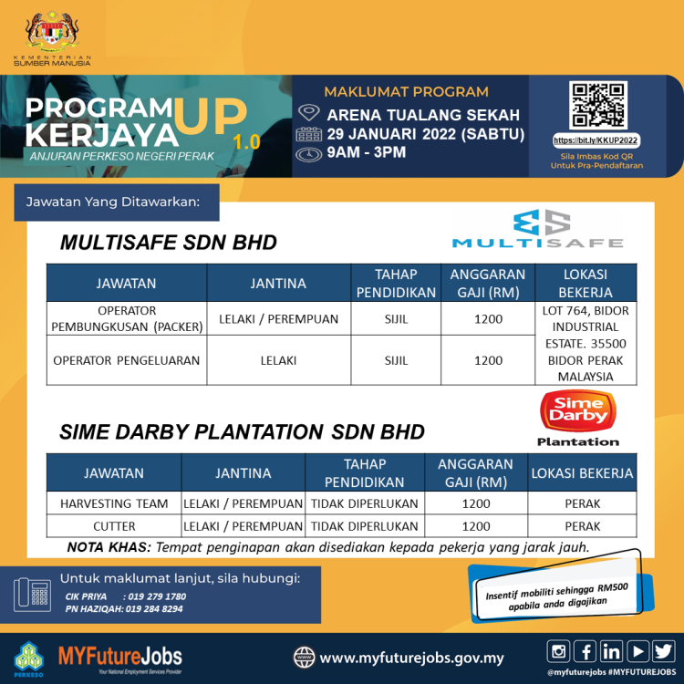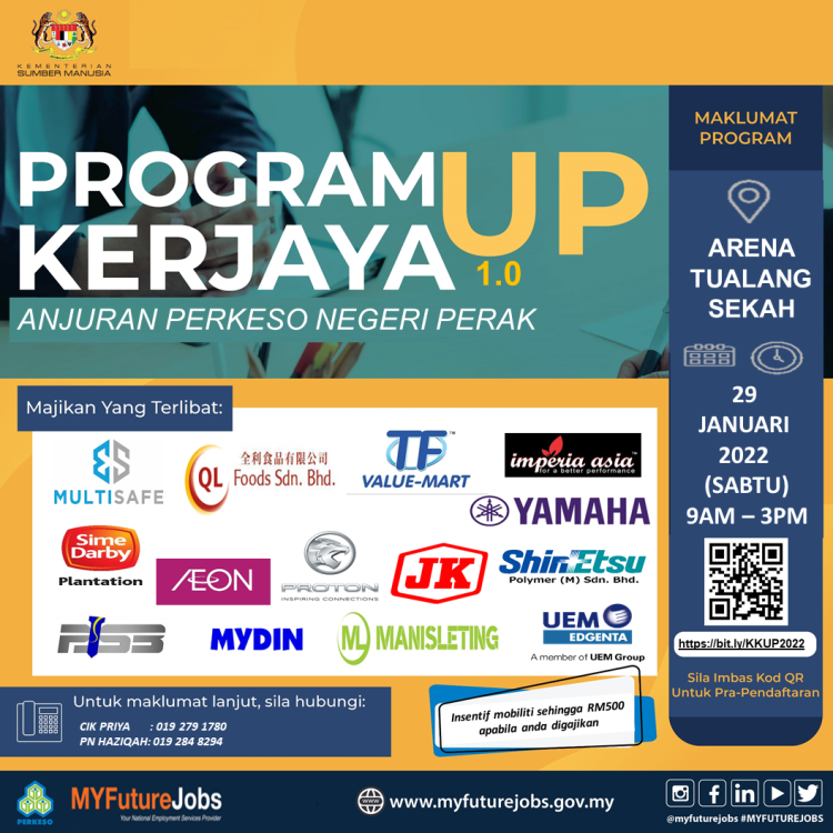 PERKESO Negeri Perak memberi peluang kepada pencari kerja di luar sana untuk hadiri temuduga terbuka secara fizikal dengan pelaksanaan Program Kerjaya Up 1.0 pada 29 Januari 2022 (Khamis) nanti. Lebih 100 kekosongan jawatan ditawarkan kepada warganegara Malaysia.