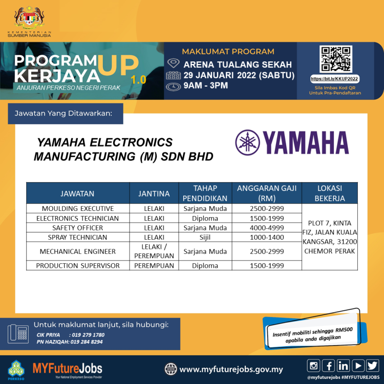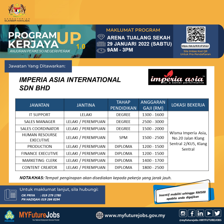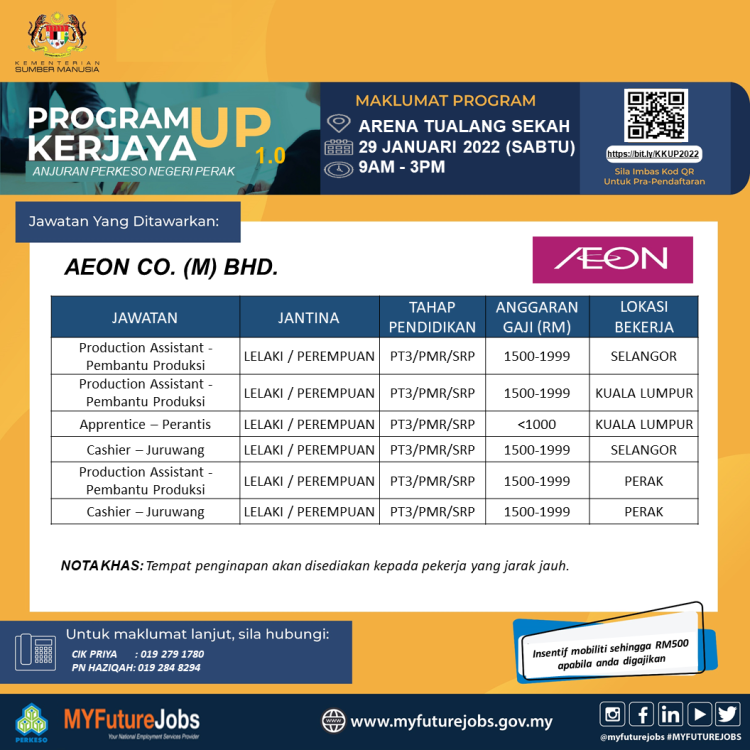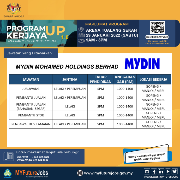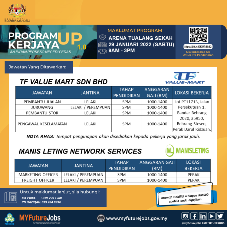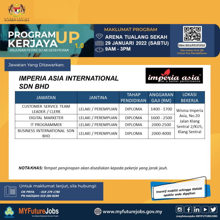 PERKESO Negeri Perak memberi peluang kepada pencari kerja di luar sana untuk hadiri temuduga terbuka secara fizikal dengan pelaksanaan Program Kerjaya Up 1.0 pada 29 Januari 2022 (Khamis) nanti. Lebih 100 kekosongan jawatan ditawarkan kepada warganegara Malaysia.