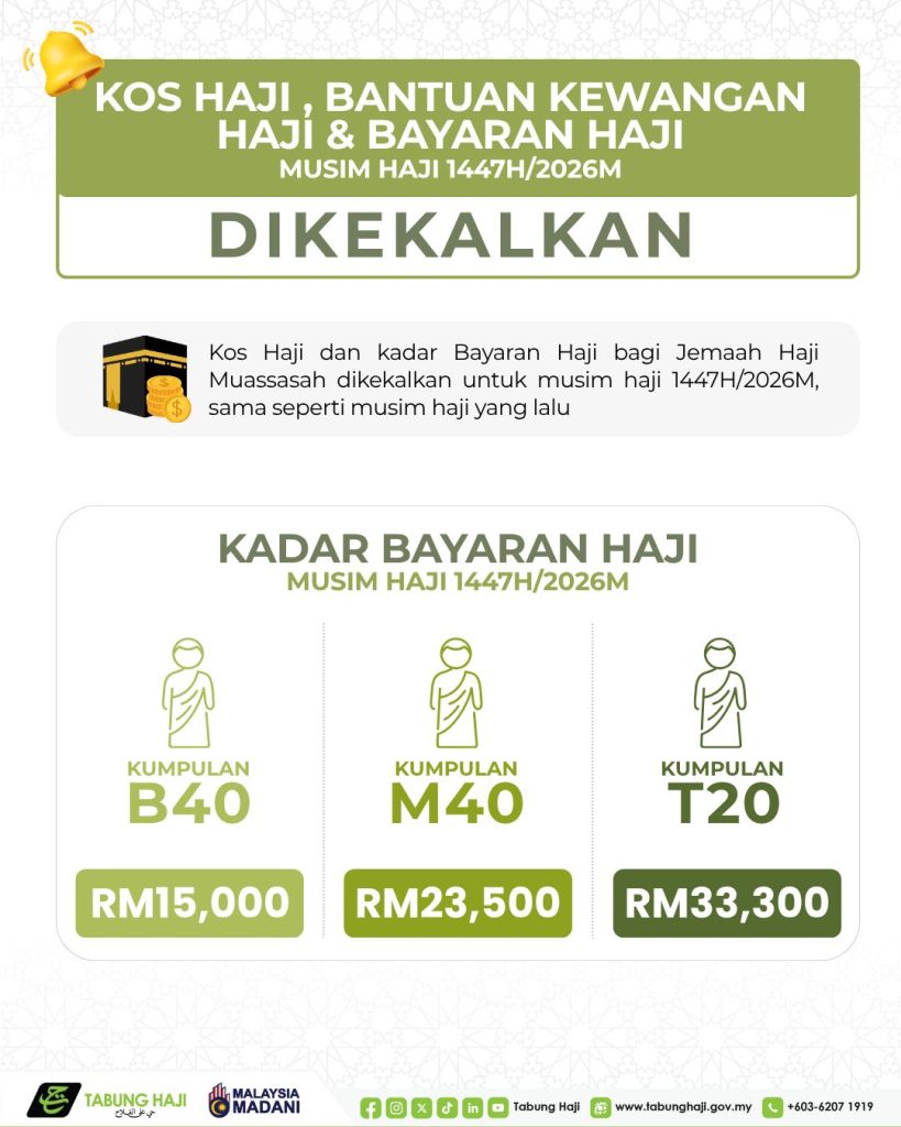 Berita baik buat bakal jemaah haji Malaysia! Lembaga Tabung Haji (TH) mengumumkan bahawa kos haji dan kadar bayaran Haji Muassasah bagi musim haji 1447H/2026M akan dikekalkan, sama seperti musim haji sebelumnya. Keputusan ini dibuat bagi memastikan kebajikan jemaah terus terpelihara di samping meringankan beban kewangan umat Islam yang bakal menunaikan ibadah suci tersebut.