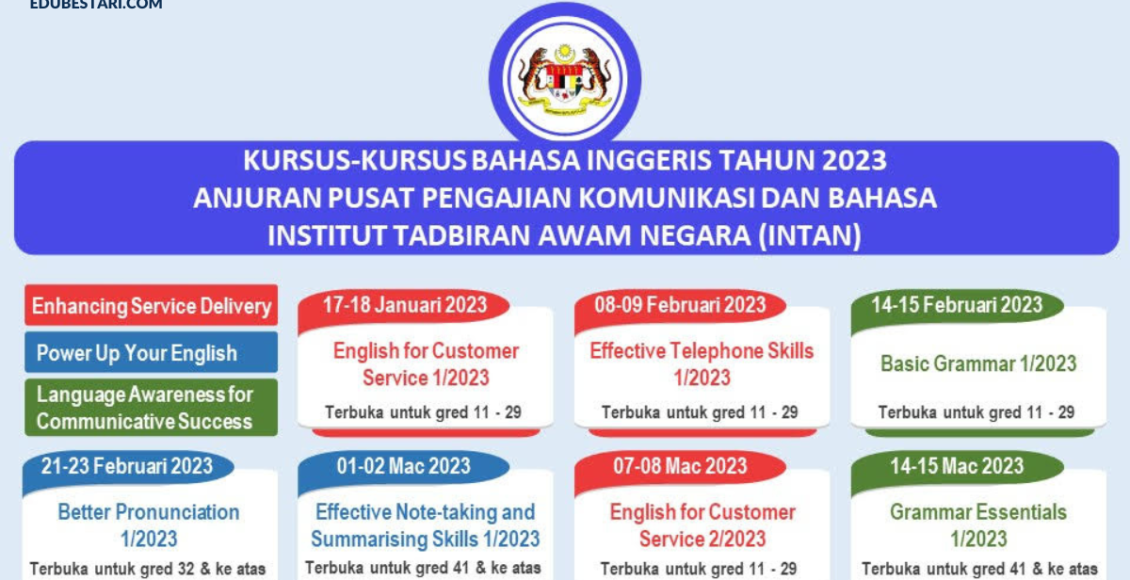 Perhatian buat penjawat awam gred 11 hingga 41 dan ke atas! Pusat Pengajian Komunikasi dan Bahasa, Institut Tadbiran Awam Negara (INTAN) Jalan Elmu akan menganjurkan kursus-kursus Bahasa Inggeris sepanjang tahun 2023 mengikut ketetapan seperti di dalam poster.
