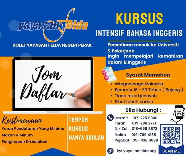 Berminat nak tambah kemahiran dalam Bahasa Inggeris? Yayasan Felda kini membuka tawaran Kursus Insentif Bahasa Inggeris kepada orang ramai yang berminat untuk mempelajari kemahiran Bahasa Inggeris untuk pelbagai tujuan. Lepasan sekolah, graduan atau orang awam yang berminat boleh ikuti program yang akan dijalankan selama 3 bulan ini.