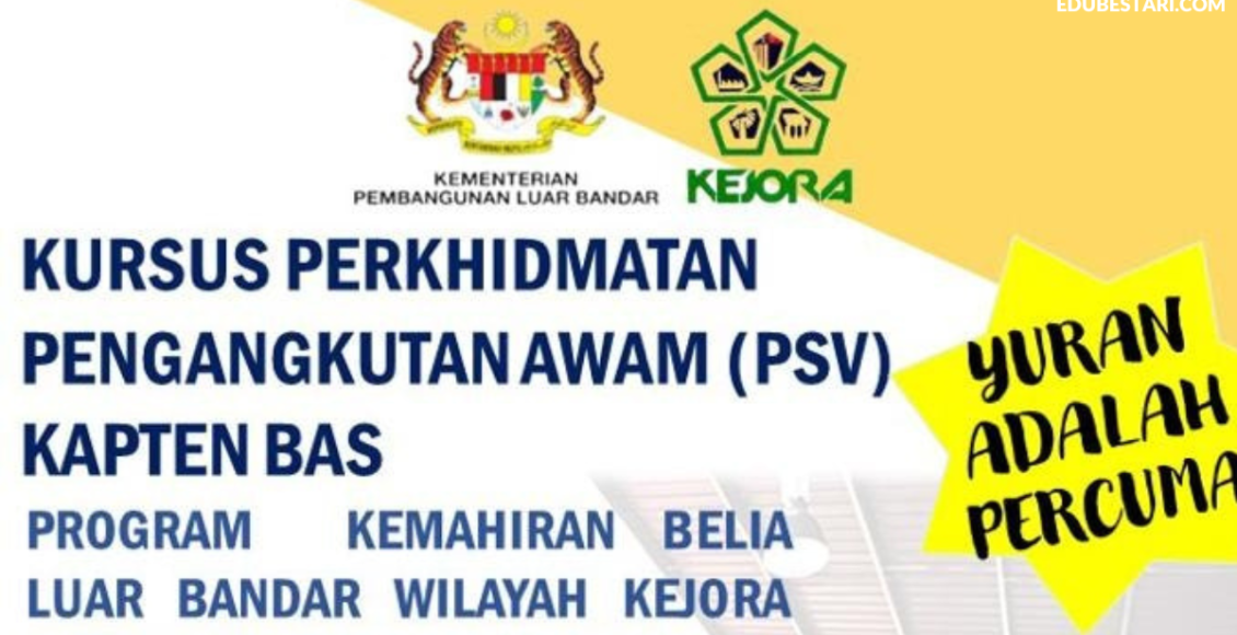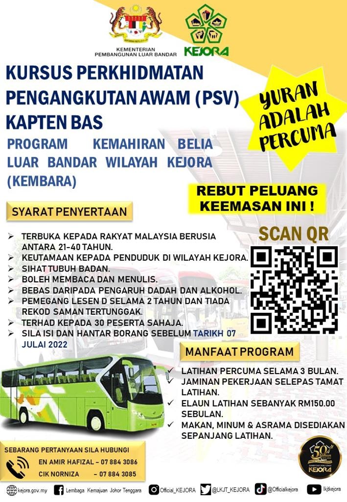 Lembaga Kemajuan Johor Tenggara (KEJORA) dengan kerjasama Kementerian Pembangunan Luar Bandar akan menganjurkan Kursus Perkhidmatan Pengangkutan Awam (PSV) sebagai Kapten Bas di bawah Program Kemahiran Belia Luar Bandar Wilayah KEJORA (KEMBARA).