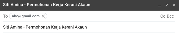 Masukkan Subject email. Jangan letak subject yang bukan-bukan, pastikan subject adalah JELAS, contohnya “Siti Amina – Permohonan Kerja Kerani Akaun”. Subject yang jelas mengandungi nama ringkas, nama jawatan dan penyataan mohon kerja.