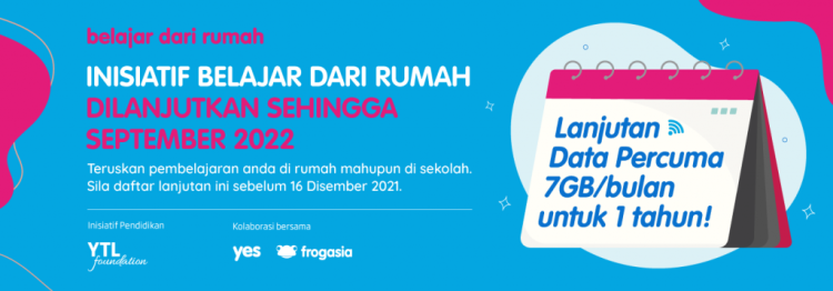 Inisiatif Belajar Dari Rumah dilanjutkan sehingga September 2022. Dengan ini, anda akan menerima data bulanan percuma dalam akaun YES anda setiap bulan sehingga 1 tahun! Untuk meneruskan lanjutan ini, anda diminta untuk buat pendaftaran sebelum 16 Disember 2021.