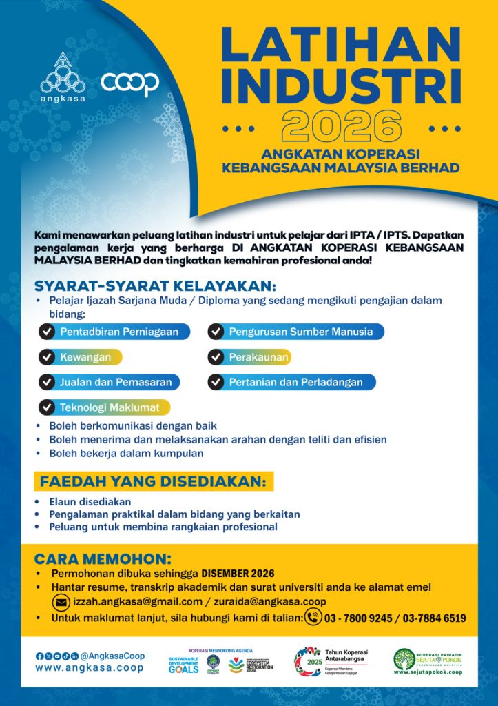 Latihan industri merupakan salah satu komponen penting bagi pelajar di institut pengajian tinggi untuk melengkapkan diri dengan pengalaman dunia pekerjaan sebenar. Bagi pelajar yang sedang mencari tempat latihan yang berkualiti, program Latihan Industri ANGKATAN KOPERASI KEBANGSAAN MALAYSIA BERHAD (ANGKASA) 2026 membuka peluang luas kepada pelajar diploma dan ijazah dari pelbagai bidang. Tawaran ini dianggap antara yang paling menarik kerana menyediakan pengalaman praktikal, elaun dan peluang membina rangkaian profesional dalam organisasi koperasi terbesar di Malaysia.