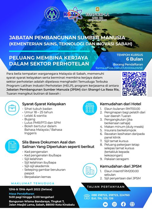 Para belia tempatan warganegara Malaysia di Sabah yang memenuhi syarat-syarat kelayakan serta berminat membina kerjaya dalam sektor perhotelan adalah dipelawa menghadiri Temuduga Terbuka Program Latihan Industri Perhotelan (HELP), program kerjasama di antara Jabatan Pembangunan Sumber Manusia dan Shangri-La Rasa Ria.