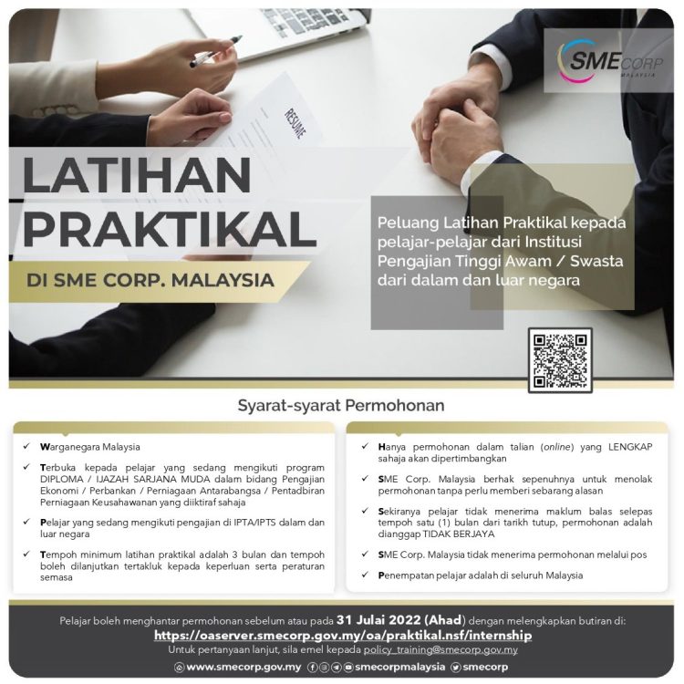 Sekiranya anda berminat untuk menjalani latihan praktikal di SME Corp Malaysia dan memenuhi syarat kelayakan dinyatakan di atas, anda boleh buat permohonan selewat-lewatnya 31 Julai 2022 secara online melalui pautan berikut: