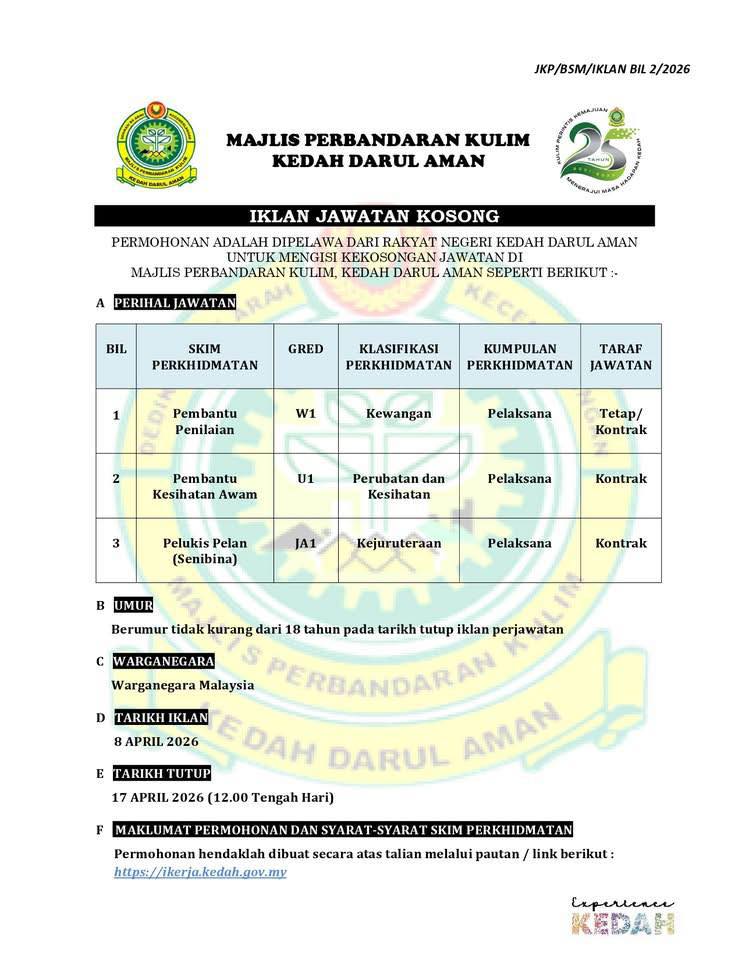 Permohonan adalah secara online melalui portal rasmi iKerja Kedah dan perlu dihantar sebelum 17 April 2026 (Jumaat), jam 12.00 tengah hari.