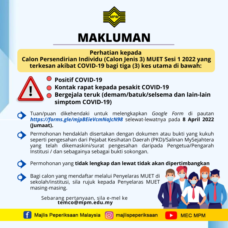 Calon-calon bagi 3 kes utama calon persendirian di atas diminta untuk isi Borang Maklum Balas Calon persendirian Individu Yang Gagal Menduduki MUET Sesi 1 Tahun 2022 Akibat Terkesan Covid-19. Berikut adalah maklumat penting: