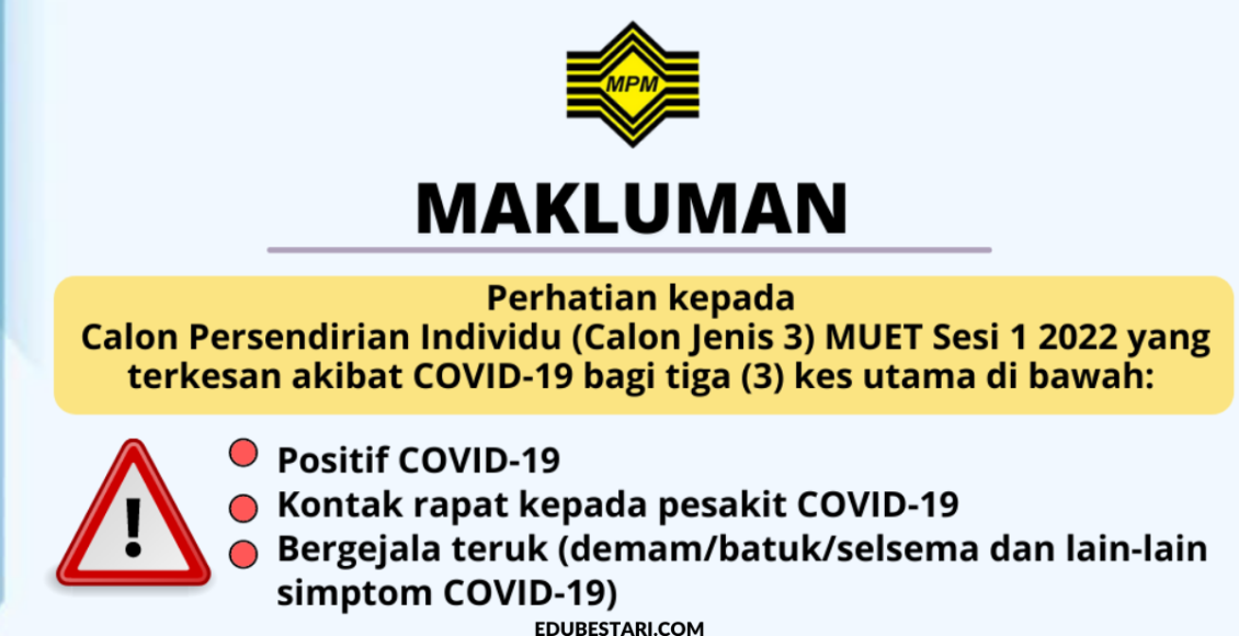 Perhatian kepada Calon Persendirian Individu (Calon Jenis 3) MUET Sesi 1 2022 yang terkesan akibat Covid-19 bagi 3 kes utama di bawah: