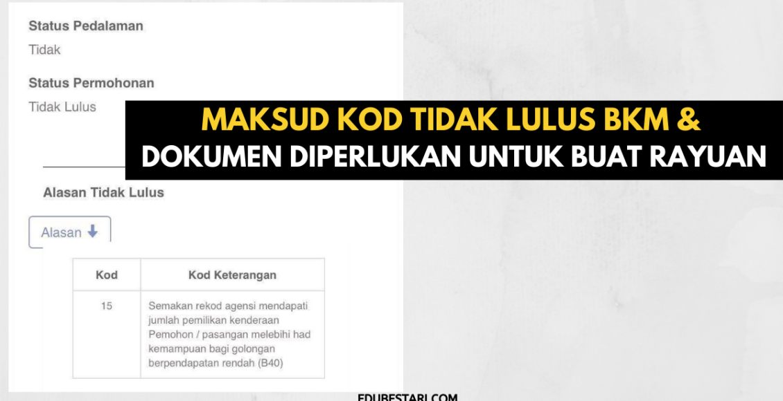 Berikut adalah maksud-maksud kod tidak lulus BKM dan dokumen diperlukan untuk buat permohonan rayuan: