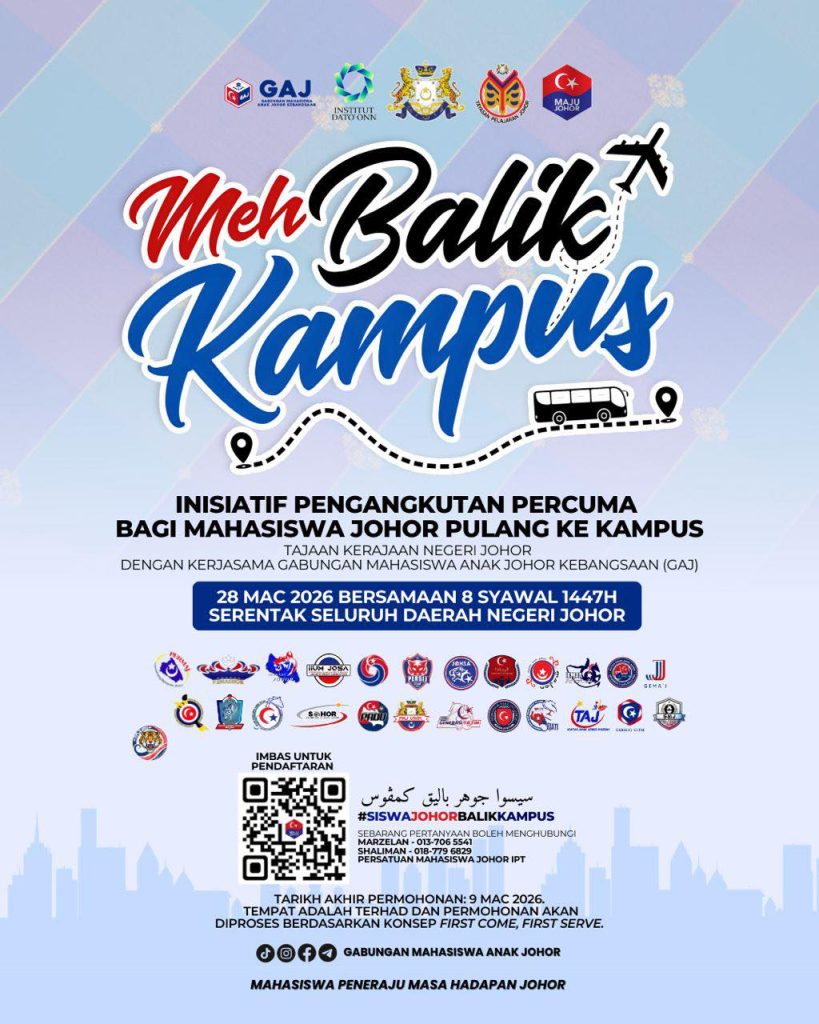 Mahasiswa Anak Johor kini mempunyai satu lagi inisiatif kebajikan yang dapat membantu mengurangkan kos perjalanan kembali ke kampus selepas musim perayaan. Program Meh Balik Kampus 2026 diperkenalkan sebagai satu inisiatif pengangkutan percuma yang ditaja oleh Kerajaan Negeri Johor dengan kerjasama Gabungan Mahasiswa Anak Johor Kebangsaan (GAJ).
