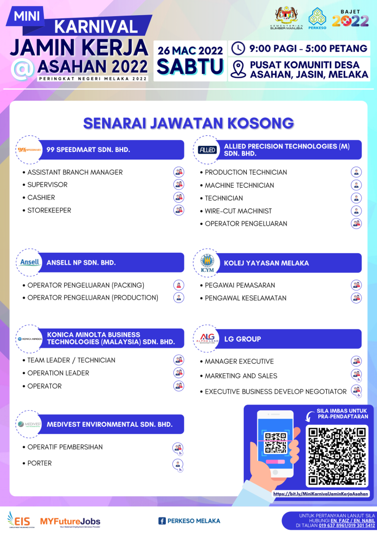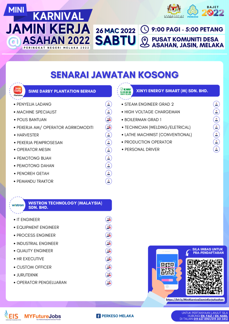 Pencari kerja yang berminat nak ikuti Mini Karnival Jamin Kerja @ Asahan 2022 Peringkat Negeri Melaka ini boleh buat pendaftaran sebelum tarikh temuduga. Pelbagai peluang pekerjaan ditawarkan oleh pelbagai majikan syarikat terkemuka.