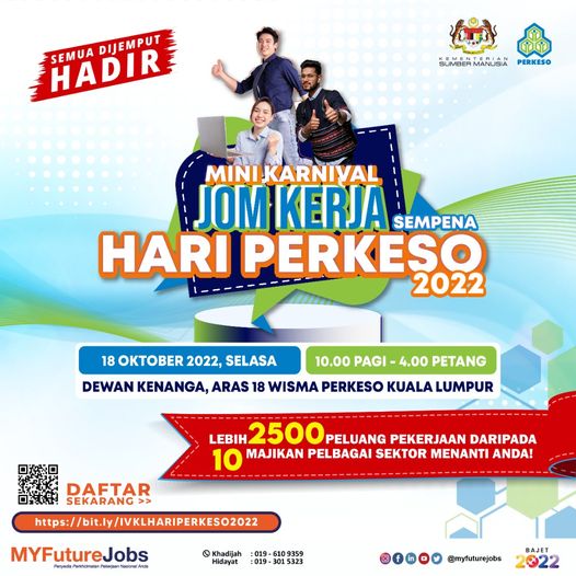 Lebih 2,500 peluang pekerjaan menanti anda di Karnival Kerjaya JaminKerja yang akan berlangsung spada 18 Oktober 2022 di Dewan Kenanga Aras 18, Wisma PERKESO Kuala Lumpur. Pelbagai aktiviti menanti anda seperti kaunseling kerjaya, bantuan pendaftaran Portal Pekerjaan Nasional, sesi temuduga dan banyak lagi.