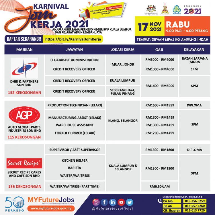 Antara majikan yang terlibat menawarkan jawatan kosong di Karnival Jom Kerja 2021 adalah: