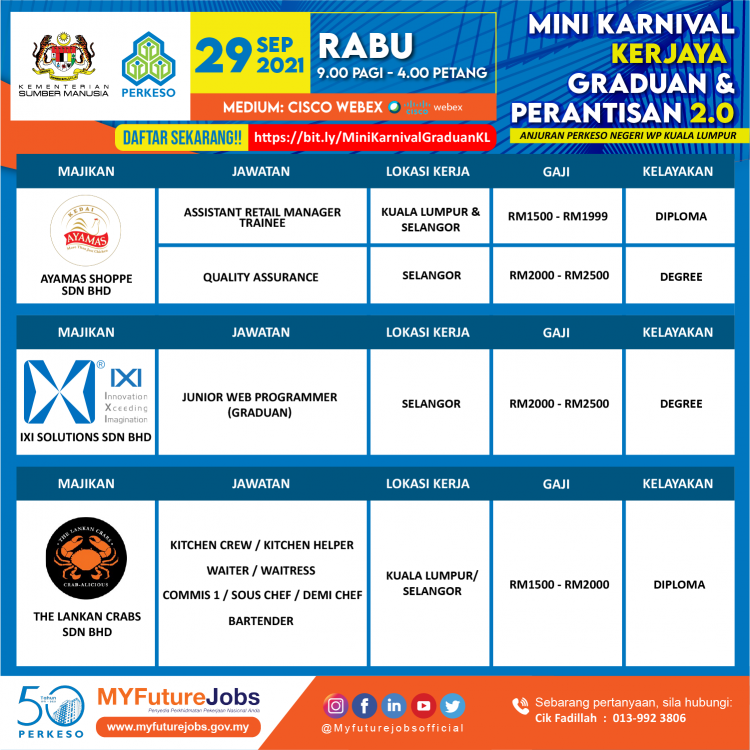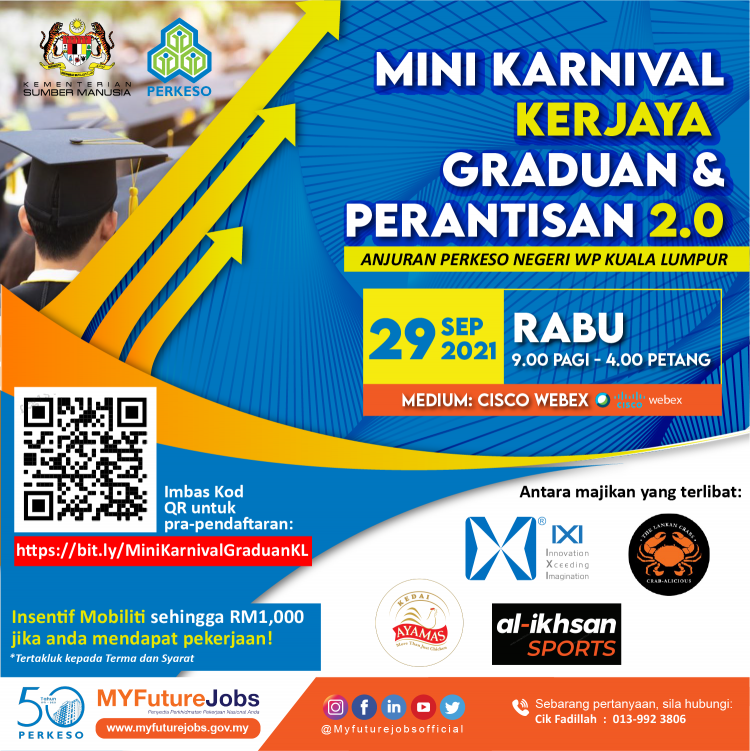 Pencari kerja dalam golongan graduan lepasan Institut Pengajian Tinggi (IPT) serta perantisan yang masih mencari pekerjaan boleh ikuti Mini Karnival Kerjaya Graduan & Perantisan 2.0 anjuran PERKESO Negeri WP Kuala Lumpur dengan kerjasama Kementerian Belia dan Sukan dan Kementerian Pengajian Tinggi.