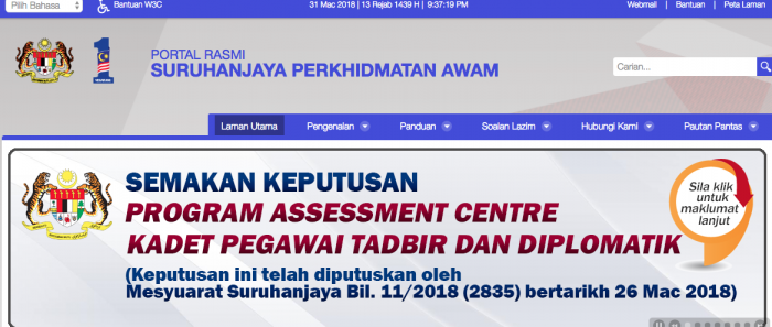 Untuk makluman anda, permohonan hanya boleh dilakukan secara online di laman web rasmi Suruhanjaya Perkhidmatan Awam (SPA).