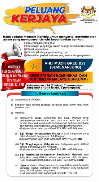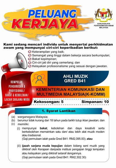 Lepasan STPM, Diploma dan setaraf yang berminat nak bekerja dalam Perkhidmatan Awam boleh mohon jawatan kosong yang ditawarkan di Kementerian Komunikasi Dan Multimedia Malaysia (K-KOMM). Jabatan Penerangan Malaysia menawarkan jawatan kosong sebagai Ahli Muzik kepada warganegara berumur 18 tahun ke atas yang berminat.