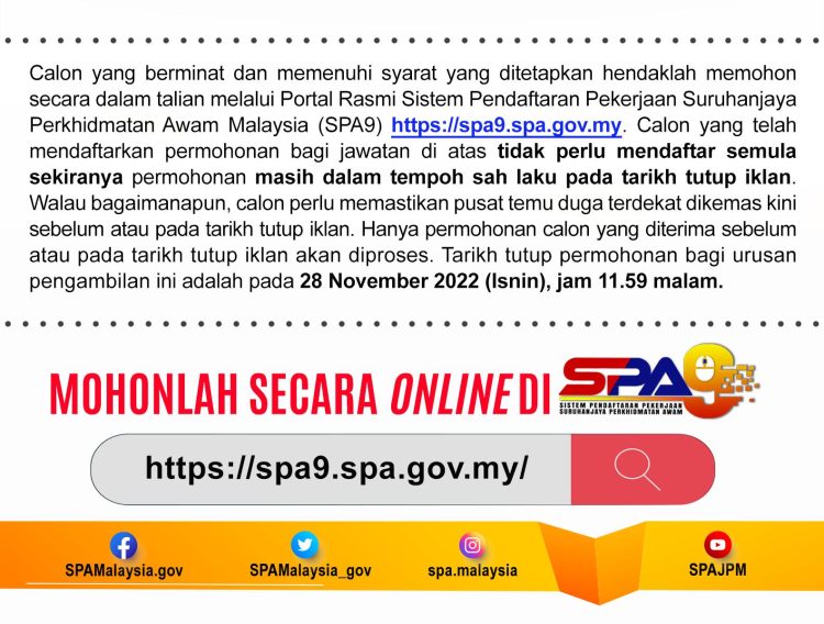 Calon yang berminat dan memenuhi syarat yang ditetapkan hendaklah memohon secara dalam talian melalui Portal Rasmi Sistem Pendaftaran Pekerjaan Suruhanjaya Perkhidmatan Awam Malaysia (SPA9).
