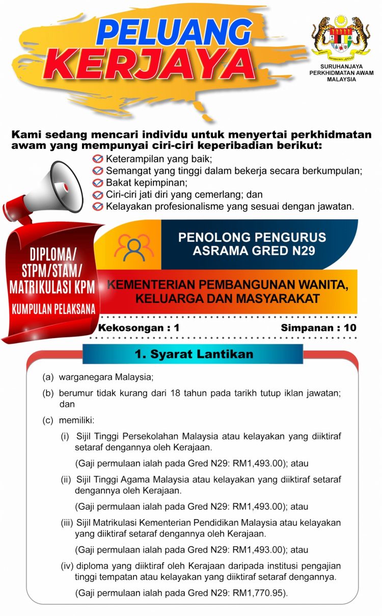 Selamat memohon kepada yang layak. Kementerian Pembangunan Wanita, Keluarga Dan Masyarakat (KPWKM) akan terus mewujudkan lebih banyak peluang perjatawan tetap dari semasa ke semasa.