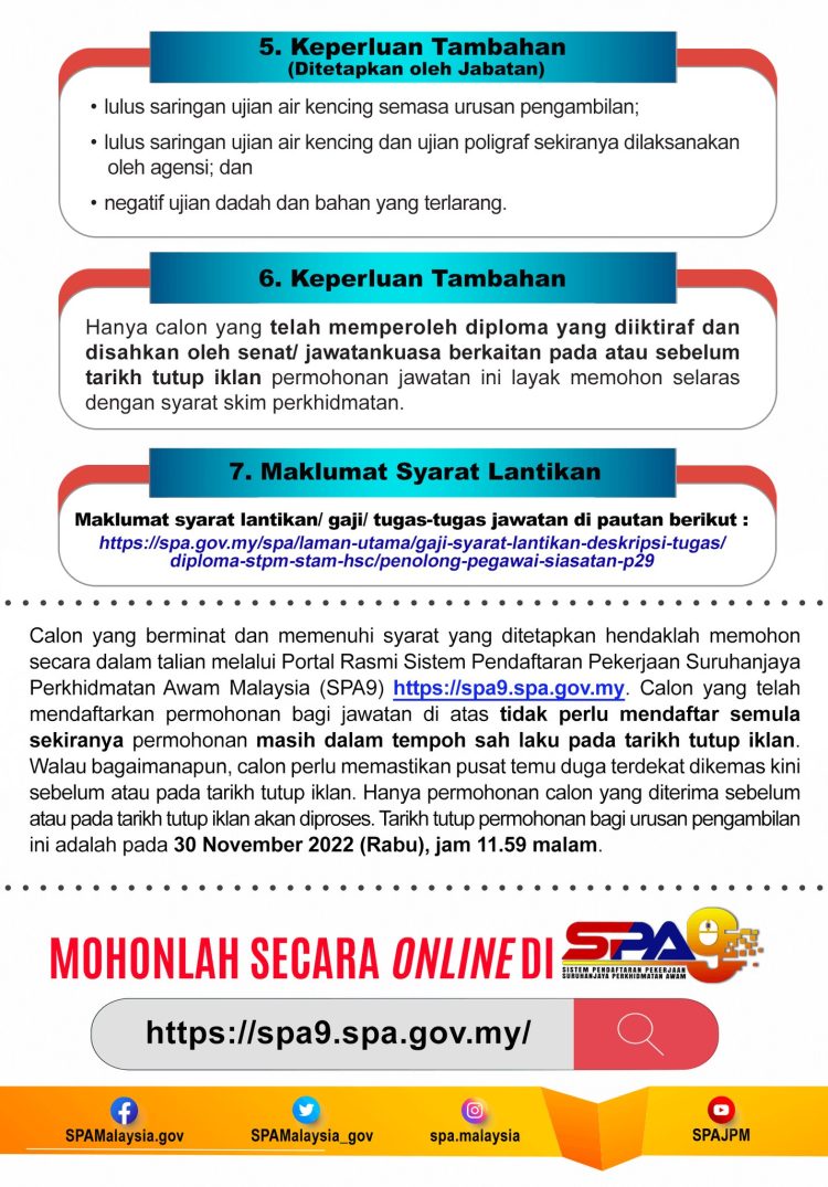 - Nama Jawatan: Penolong Pegawai Siasatan Gred P29