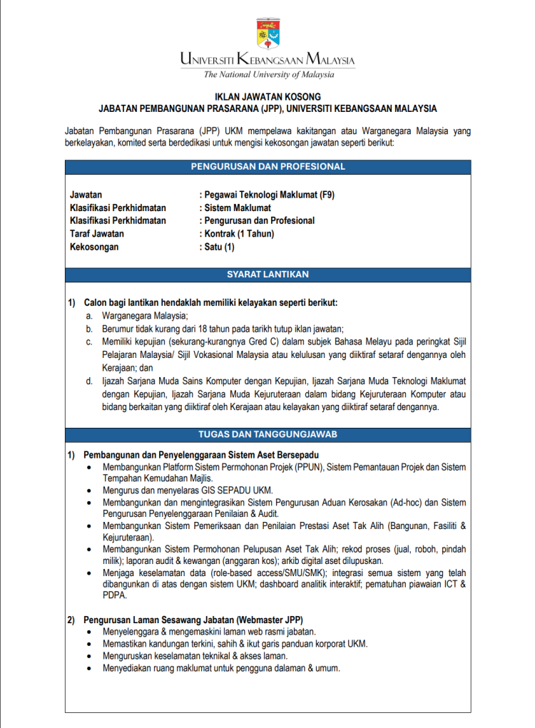 Universiti Kebangsaan Malaysia (UKM) membuka peluang kerjaya kepada calon berkelayakan bagi mengisi kekosongan Pegawai Teknologi Maklumat (F9) di bawah Jabatan Pembangunan Prasarana (JPP). Jawatan ini ditawarkan secara kontrak selama 1 tahun dan melibatkan satu kekosongan sahaja.