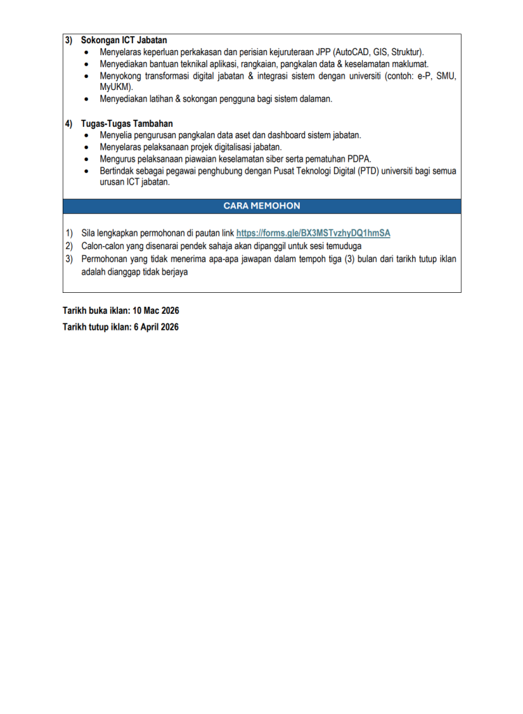 Bagi calon yang sedang mencari jawatan kosong IT di universiti awam, iklan ini wajar diberi perhatian kerana skop tugasnya bukan sekadar sokongan teknikal biasa, sebaliknya turut melibatkan digitalisasi jabatan, pengurusan sistem aset, keselamatan maklumat dan pematuhan PDPA.