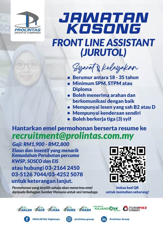 Rakyat Malaysia yang berminat nak jadi Front Line Assistant atau Jurutol, kini anda boleh mohon pengambilan jurutol Prolintas dengan kelayakan minima SPM, STPM atau Diploma. Gaji lumayan beserta pelbagai elaun ditawarkan kepada pekerja.