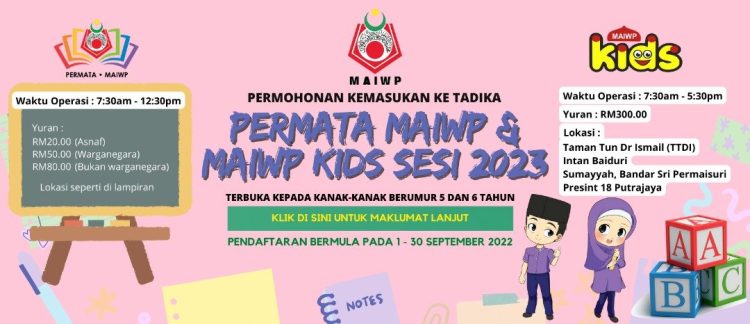 Ibu bapa yang berhasrat nak hantar anak berumur 5 tahun pada tahun 2023 ke Tadika Permata MAIWP dan MAIWP Kids dah boleh mula buat permohonan mulai 1 September 2022. Permohonan kemasukan ke Tadika Permata MAIWP dan MAIWP Kids cawangan Kuala Lumpur, Putrajaya, dan Labuan akan dibuka secara dalam talian (online).
