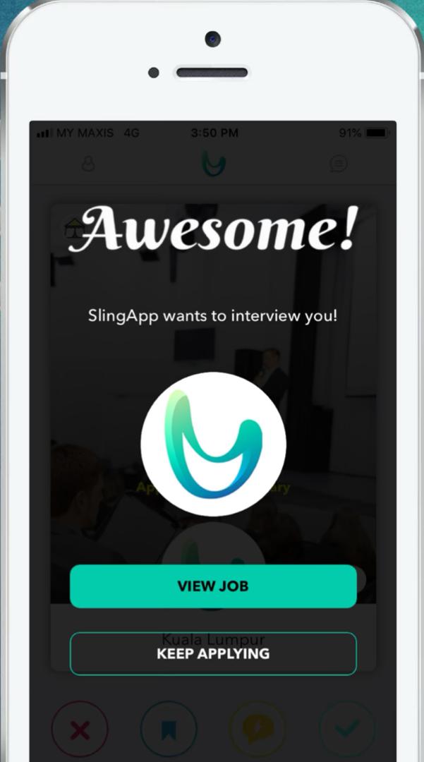 Dengan features SlingApp iaitu Auto Interview, anda akan terus ditemuduga segera melalui aplikasi SlingApp sekiranya jawatan yang dimohon sepadan dengan kriteria yang dikehendaki oleh majikan.