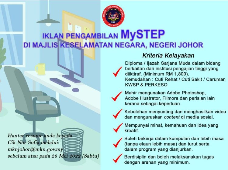 Kepada graduan yang sedang mencari pekerjaan dan memiliki sekurang-kurangnya Diploma atau Ijazah Sarjana Muda dalam bidang berkaitan dan diiktiraf oleh kerajaan, Majlis Keselamatan Negara (MKN) mempelawa anda untuk mohon kekosongan MyStep yang ditawarkan.