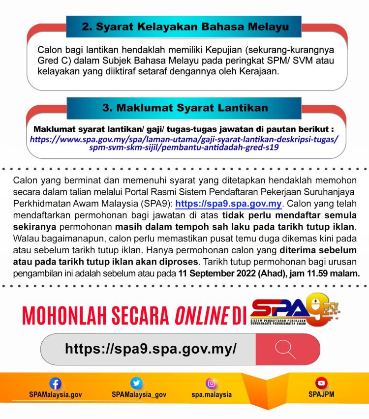 Warganegara Malaysia yang cukup syarat kelayakan yang ditetapkan dan berumur tidak kurang daripada 18 tahun pada tarikh tutup jawatan adalah dipelawa untuk mengisi kekosongan jawatan Pembantu Antidadah S19 yang ditawarkan oleh Agensi Antidadah Kebangsaan (AADK).