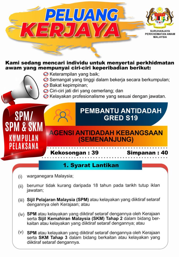 Warganegara Malaysia yang cukup syarat kelayakan yang ditetapkan dan berumur tidak kurang daripada 18 tahun pada tarikh tutup jawatan adalah dipelawa untuk mengisi kekosongan jawatan Pembantu Antidadah S19 yang ditawarkan oleh Agensi Antidadah Kebangsaan (AADK).