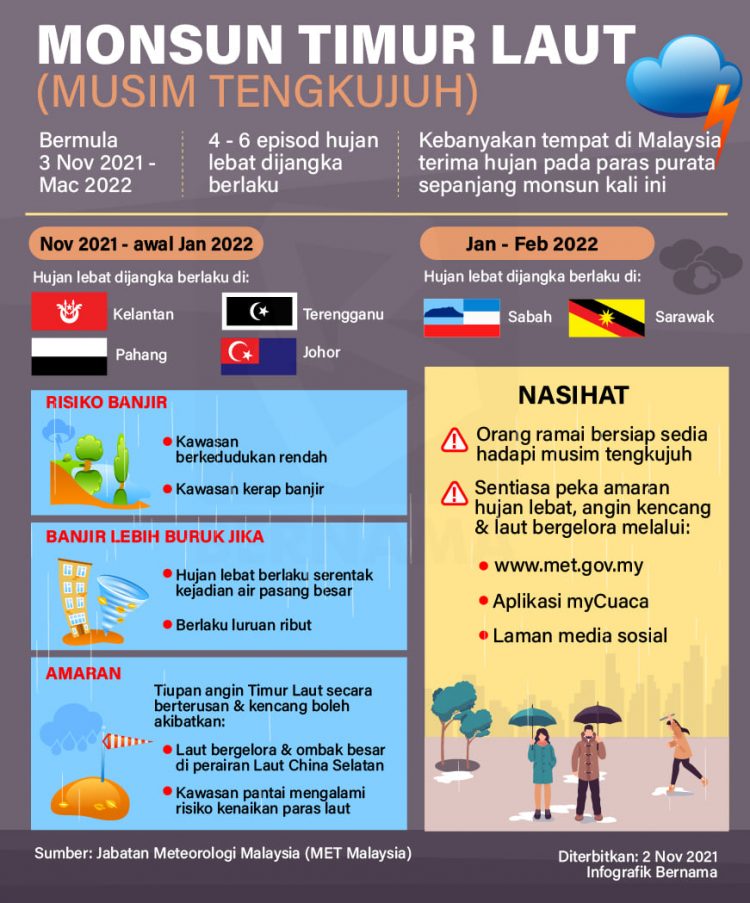Ikuti perkongsian di bawah untuk maklumat lanjut mengenai Monsun Timur Laut (Musim Tengkujuh) yang dikeluarkan oleh Jabatan Meteorologi Malaysia (MET Malaysia).