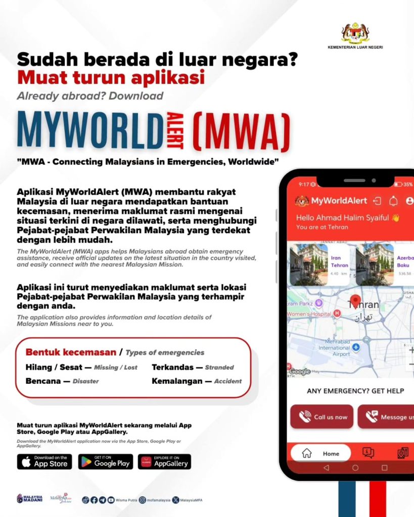 Aplikasi MyWorldAlert sangat berguna kepada rakyat Malaysia yang berada di luar negara seperti: