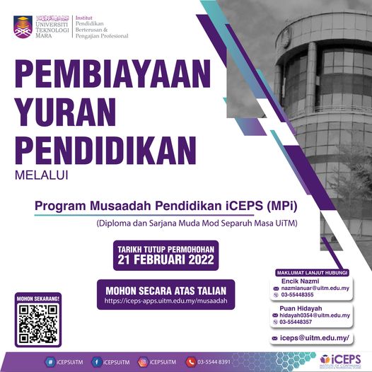 Institut Pendidikan Berterusan & Pengajian Profesional (iCEPS) UiTM mempelawa pelajar yang sedang melanjutkan pengajian di peringkat diploma dan sarjana muda mod separuh masa UiTM untuk memohon pembiayaan yuran pengajian melalui Program Musaadah Pendidikan iCEPS.
