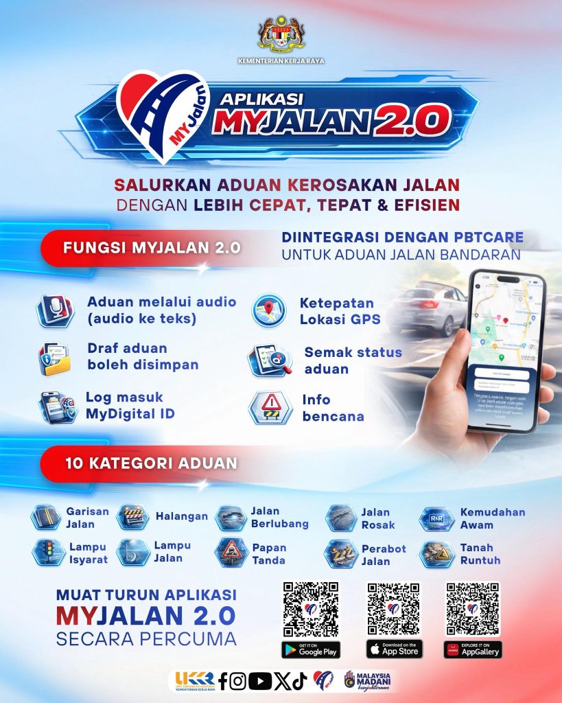 Aplikasi MYJalan 2.0 ialah platform rasmi yang membolehkan orang awam membuat aduan kerosakan jalan secara lebih cepat, tepat dan efisien, termasuk integrasi dengan PBTCare untuk aduan jalan bandaran.