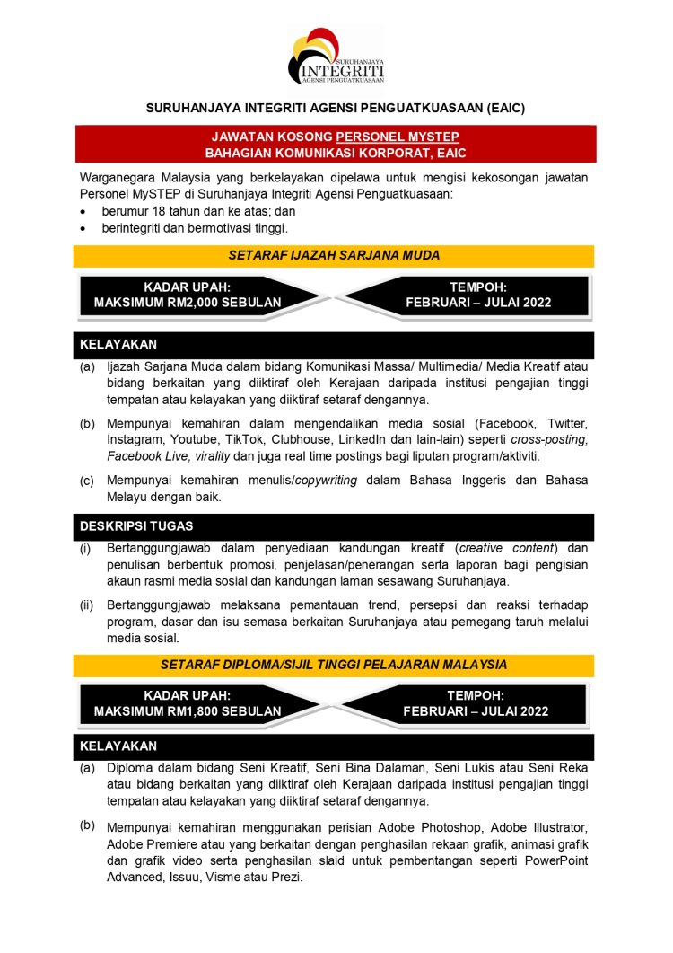 Anda graduan lepasan Ijazah atau diploma/STPM/Sijil yang sedang mencari kerja dan peluang untuk bina kerjaya? Jom bina kerjaya dengan peluang penempatan MySTEP yang dibuka oleh Suruhanjaya Integriti Agensi Penguatkuasaan (EAIC) tahun 2022 ini! Calon yang layak mendapat penempatan akan berkhidmat secara kontrak pada tahun 2022.