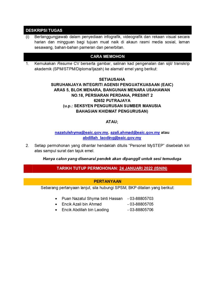 • Majikan: Suruhanjaya Integriti Agensi Penguatkuasaan (EAIC)